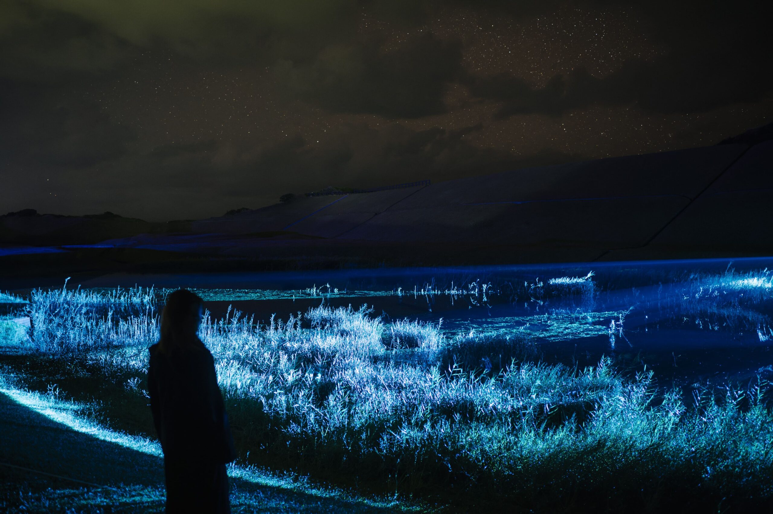 鑑賞者は大きな青い光の海に囲まれるような体験をします。しかし作品全体は高速で振動しており、そこにあるようかのように見えるものは、全て目や脳に残る残像です。私たちが見ているものは現実ではなく、あくまでも私たちの感覚器官が捉え認識する、世界の一つの姿なのです。