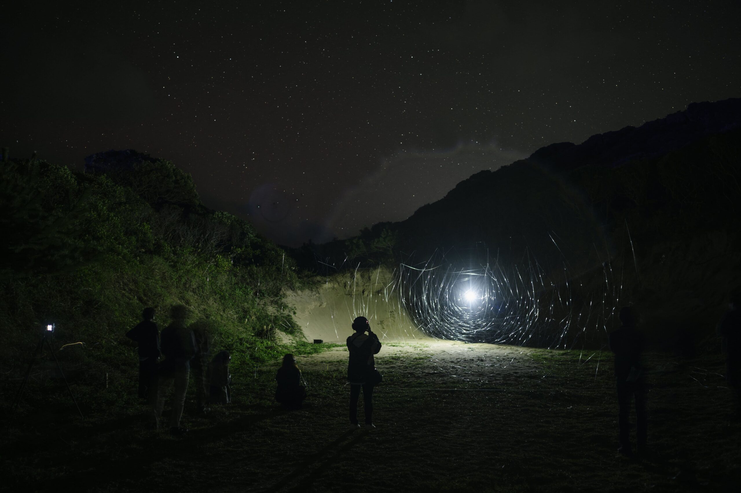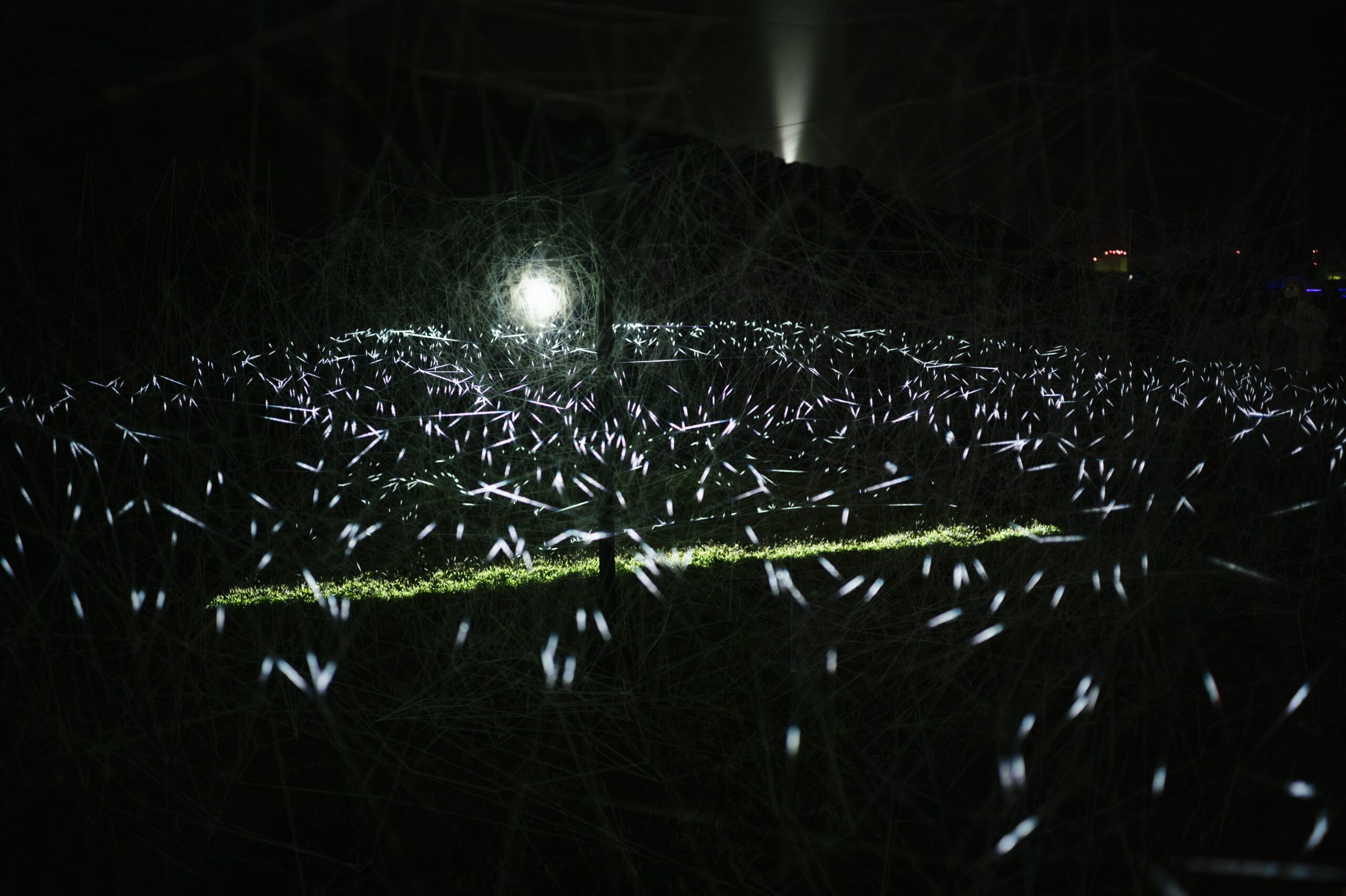 空間全体に約5km分のナイロン糸が立体網目状に張り巡らされています。光源が海からの風に揺らぎ、光の動きと鑑賞者の動きに反応し、ナイロン糸の反射光-空気の傷のようなもの-が、空間内全体を静かに移動していきます。
