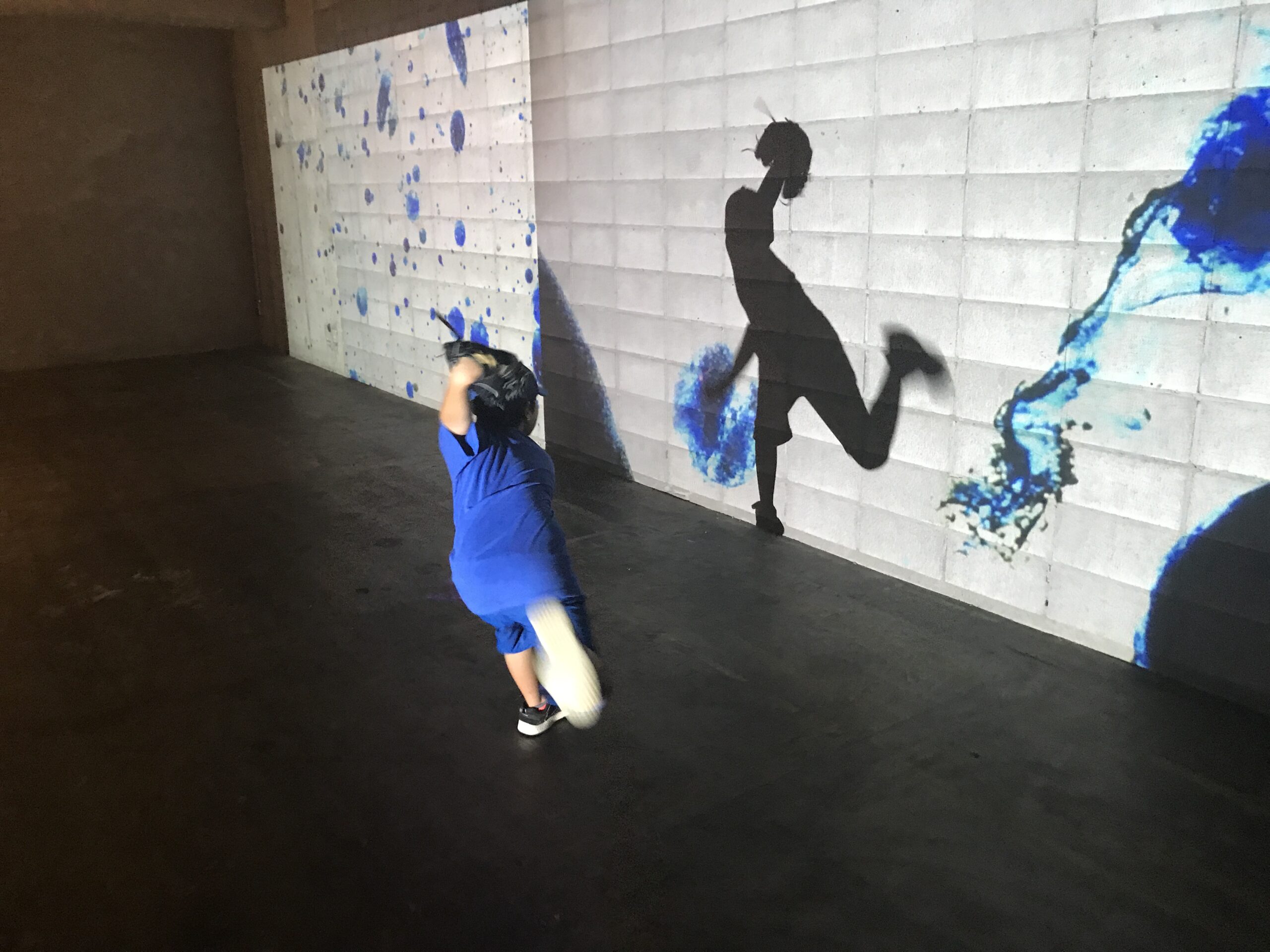 壁に映る作品映像に自分の影を投影して、自分に映る映像を楽しんだり、近距離の影やちょっと離れたところの影を重ねて巨人になったり小人になったりして遊ぶ作品です。