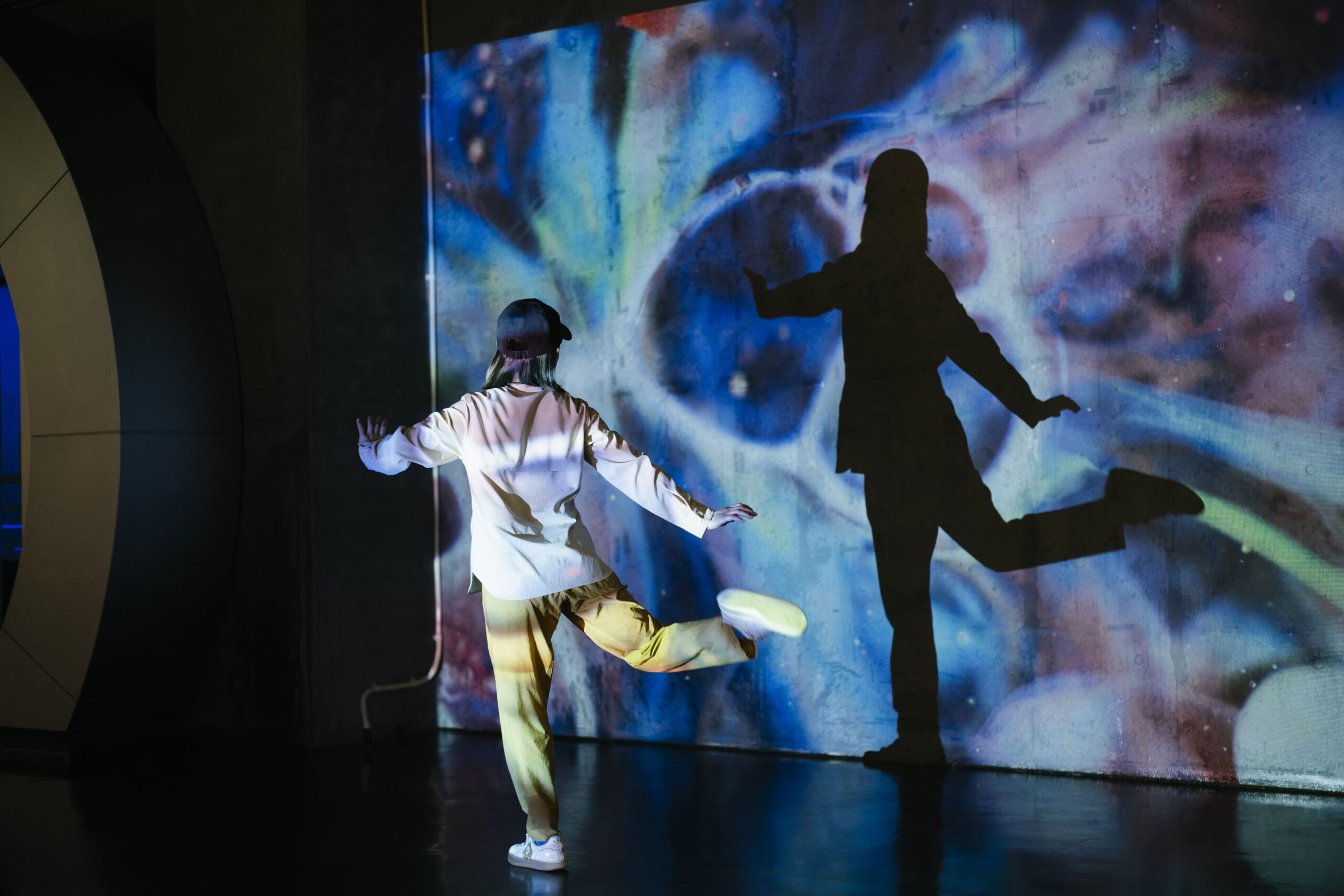 壁に映る作品映像に自分の影を投影して、自分に映る映像を楽しんだり、近距離の影やちょっと離れたところの影を重ねて巨人になったり小人になったりして遊ぶ作品です。
