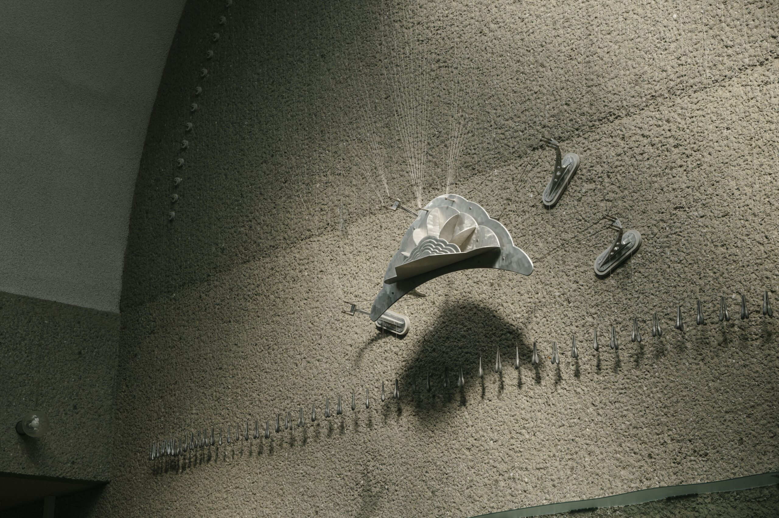 作品の中央にあるオブジェは、多くのワイヤーによって吊り下げられ空中に浮かんでおり、ワイヤーにつながる錘の重力によって成立しています。