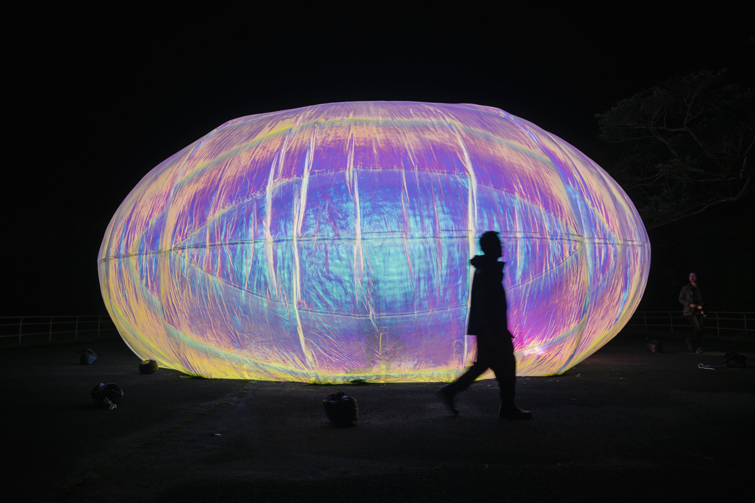 空気と水と太陽の柔らかい彫刻。 極光色に輝き、 風で大きくたゆたう作品は、 触って 鑑賞することができます。 作品内部に入ると周囲の光が淡く広がり、 幻想的な空間を 体験できます。 《世界の泡構造》と《関係性のダイナミズム》をモチ ーフに、 光を映 す薄いフィルムで作られた被膜と、 わずかな気圧差で自立する構造体は、 柔らかく弾 カのある感触で見えない空気の存在を感じることができます。 『私達の見えない関係性にも形があり、 構造や機能もあると思います。 それらについて 考えていくと、 我々を地球上で育んでくれている空気や水や光の性質や力学にとても類 似していると思えます。 』 作者は具体的な鑑賞体験を通して、 通常は目に見えない人と社会との関係を、 作品を通 じて可視化します。 天候や観る角度、 風の揺れで色合いが変化する作品は、 自己の変動性や多面性、 あるいは人間の多様性を肯定的に反映し、 さらに空気を通じて私たちに地 球環境の重要性を暗示しています。
