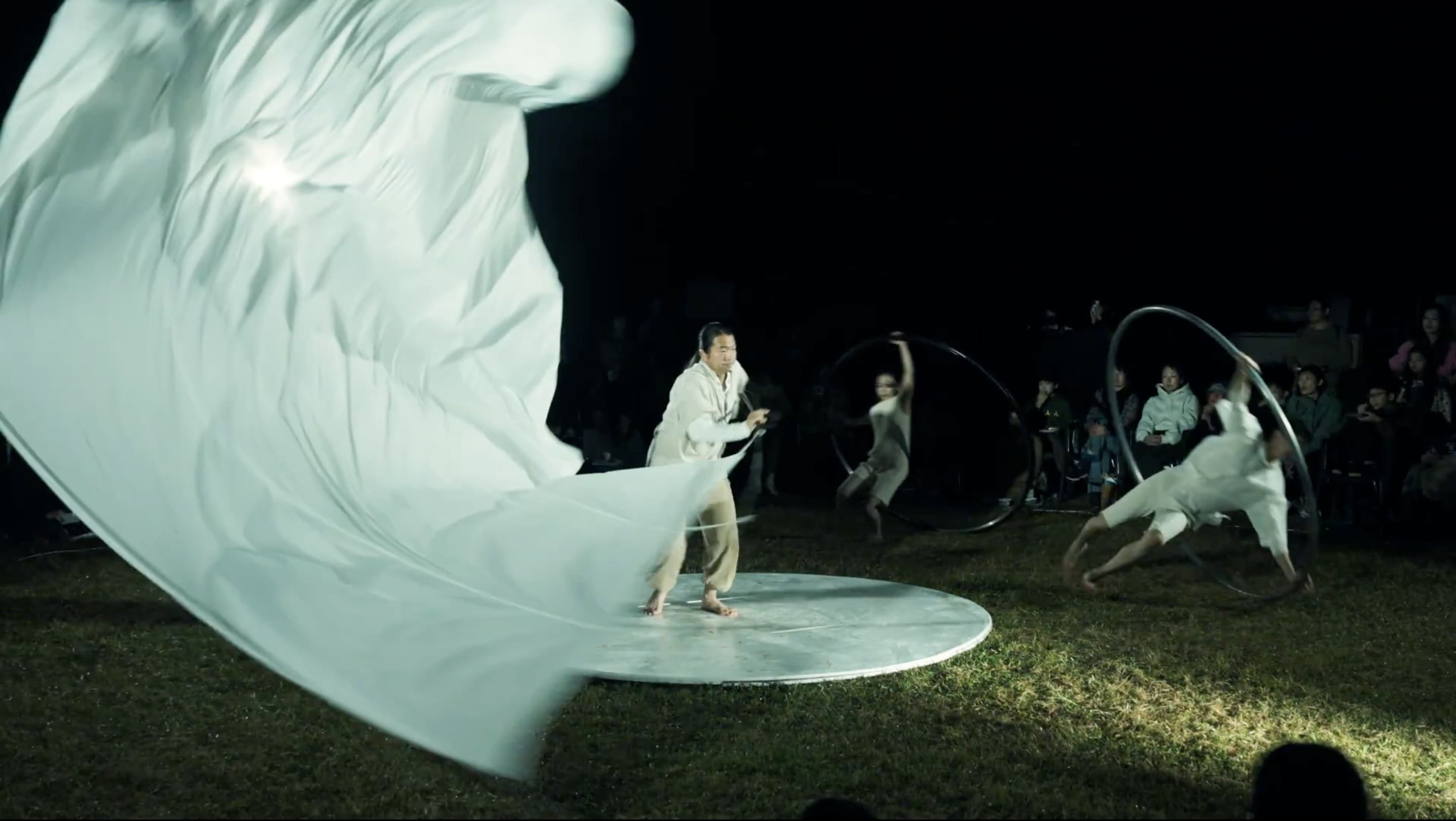 大旗が風をまとい、シルホイールが光をなぞる、自然を感じるサーカス。
