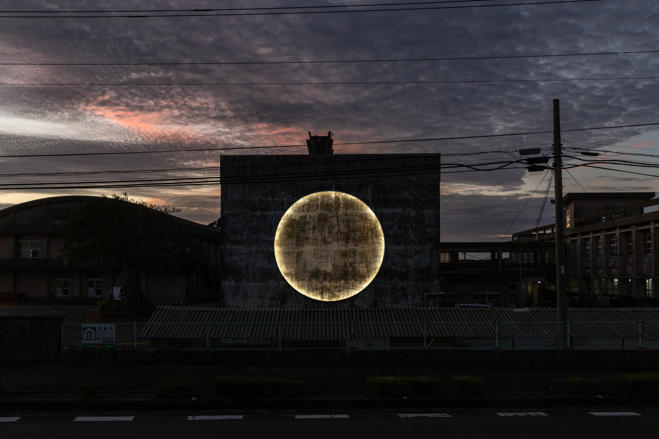 2010年に廃校となった南種子高校の校舎壁に出現する、巨大な惑星を思わせる作品。フレネル効果を再現した光のリングと、コンクリート壁の経年模様が重なり、時を経た建築に新たな宇宙の情景が広がる。