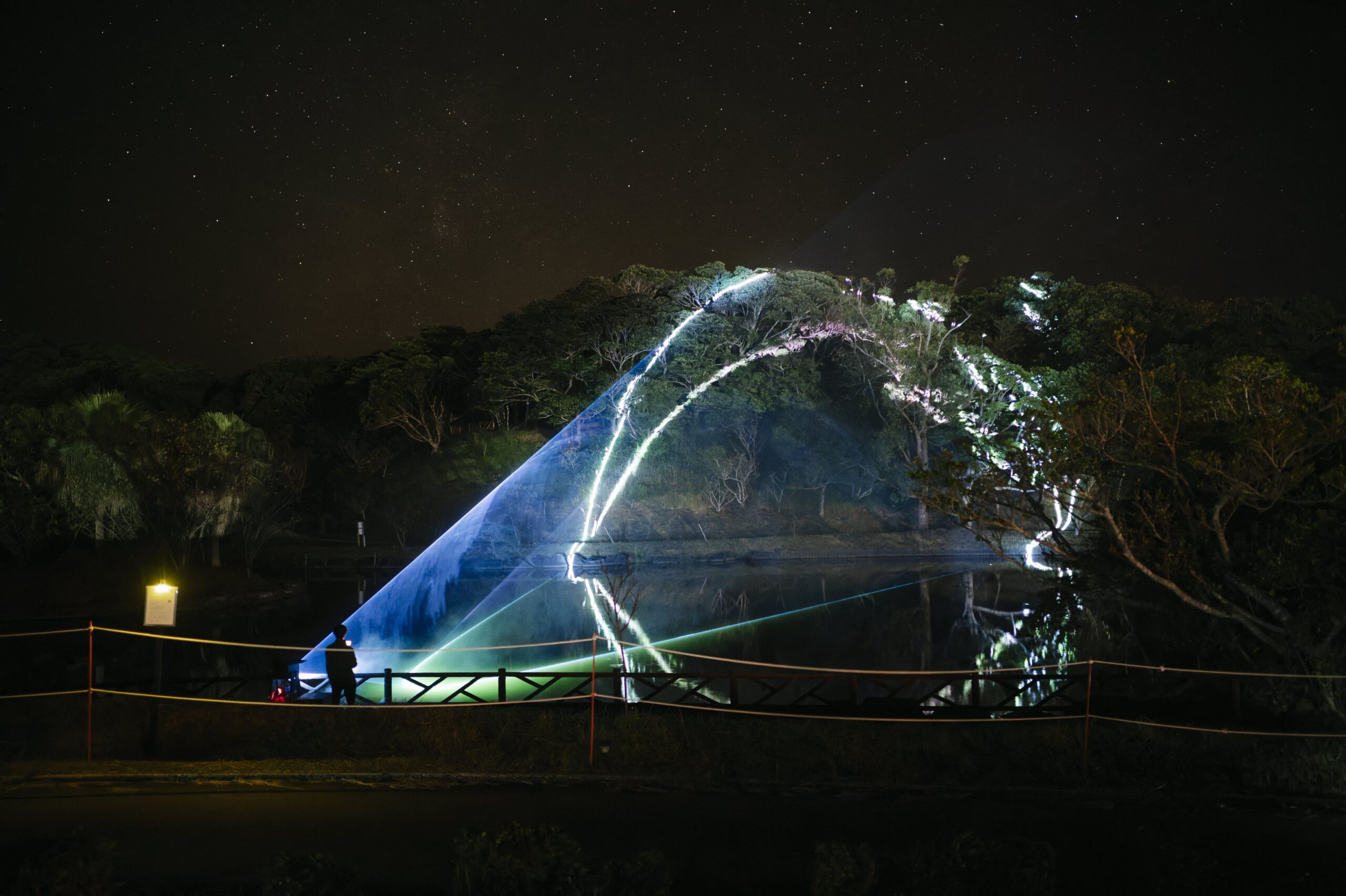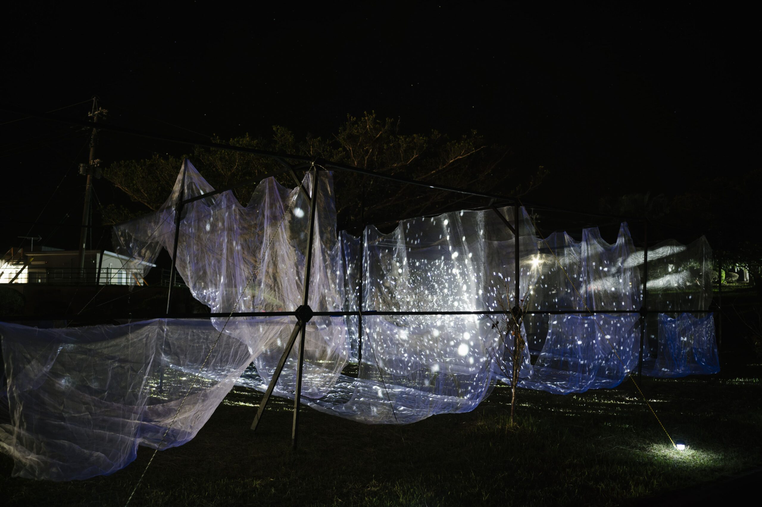 《Organic Space》(2025)は、2023年にパリで発表された室内インスタレーション《Organic Space》を自然環境へと拡張した初の野外作品である。ノ・サンヒは光、メッシュ布、空気、風などの非物質的な要素を造形素材として扱い、投影された光の軌跡を空間に描かれる“ドローイングの行為”として提示している。 本作は単なる映像投影の装置ではなく、光そのものが形を生み出し、消えていく過程を通じて、絵画・彫刻・映像の境界を横断する視覚的構造をつくり出す。 初期の室内バージョンでは、2台のビデオプロジェクターを用いて垂直方向に分割された光の線をメッシュ布上に描き出していたが、種子島での新作では同じ構造的原理を自然の空間に展開している。人工照明の代わりに、空気、風、霧が生み出す抵抗と反射によって形が自律的に変化していく。夜の空気の中で白い光の線はかすかに震え、風の動きに合わせて軌跡を変えながら消えていく。 観客は作品の内部に入ることなく外側からその変化を見つめる。これはまるでスクリーンのない映画を観るように、イメージではなく光の時間性を体験する行為である。光はメッシュ布と空気を通過しながら境界と形を同時に解体し、開かれた自然空間を“生きたキャンバス”へと変化させる。 《Organic Space》(2025)は、プロジェクターの光を物質化し、光・空間・時間の関係を探求する試みである。固定された映像ではなく、絶えず変化し消えていく**「光の彫刻」**として、観客の視線と自然のリズムの中で完成する開かれた構造の作品である。